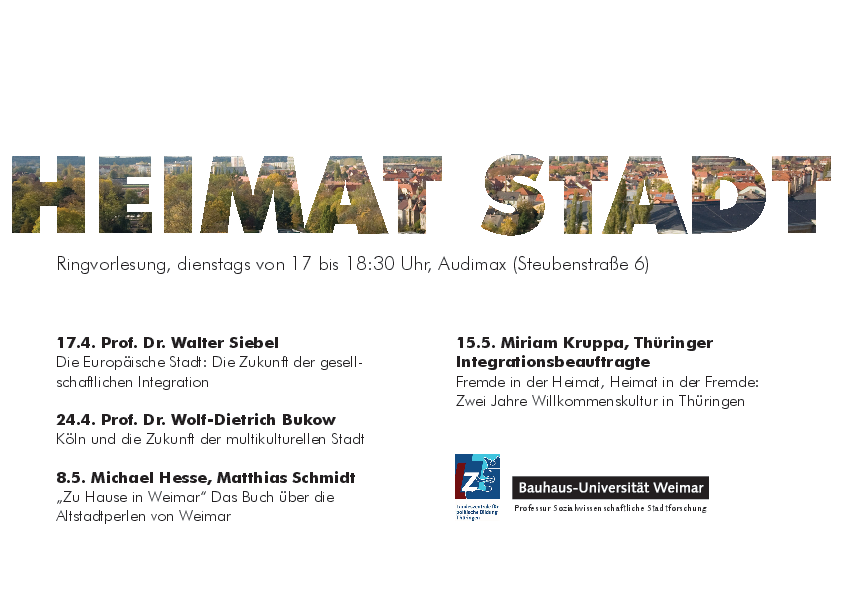 Die Professuren Sozialwissenschaftliche Stadtforschung und Denkmalpflege und Baugeschichte der Bauhaus-Universität Weimar veranstalten die Ringvorlesung im Sommersemester 2018. Interessierte Gäste sind herzlich dazu eingeladen. Der Eintritt ist frei.