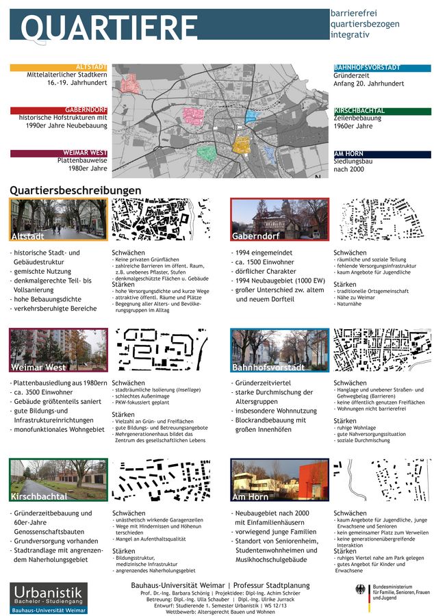 Das an der Professur Stadtplanung entstandene Projekt »Altersgerechtes Wohnen in Weimar« erhielt eine lobende Anerkennung. In der Arbeit setzen sich 24 Studierende des ersten Semesters im Studiengang Urbanistik mit sechs Wohnquartieren verschiedensten Baualters und unterschiedlichster Stadtstrukturen ihrer neuen Heimatstadt auseinander. Dabei wurden die Wohnbedürfnisse aller Generationen – von Jung bis Alt – berücksichtigt. Entstanden sind Quartierskonzepte mit Empfehlungen und zukunftsweisenden Vorschlägen, die die jeweiligen Wohnumfeldsituationen und Infrastruktureinrichtungen weiterentwickeln. Die Anerkennung ist mit 1.500 € dotiert.