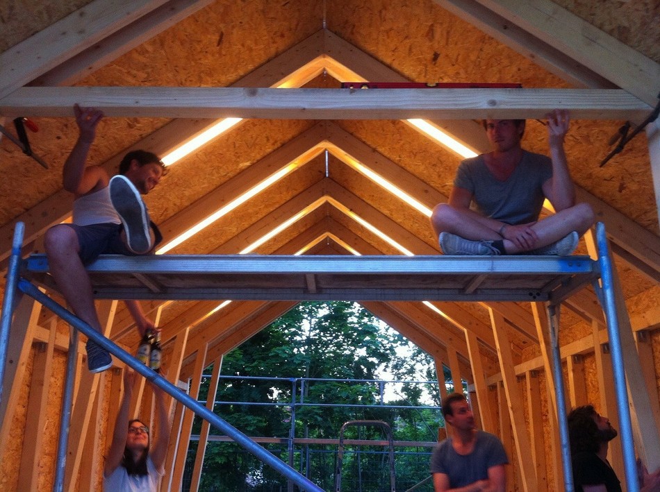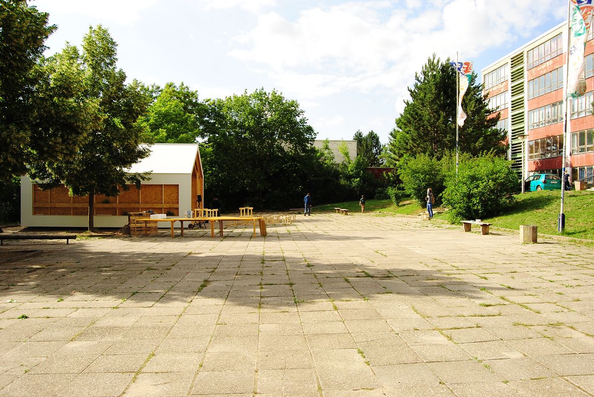 Studierende der Bauhaus-Universität Weimar haben diesen multifunktionalen Pavillon innerhalb des Sommersemesters 2015 als Außenklassenzimmer für die Gemeinschaftsschule Weimar geplant und realisiert. Er ist 35 m² groß und dient künftig beispielsweise als Klassenzimmer und Werkstatt. Die Entwürfe dafür sind in einem Beteiligungsprozess mit der Schulgemeinschaft entstanden.