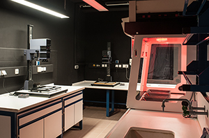 Damit können Studierende ab sofort die Leistungen der Dunkelkammer in Anspruch nehmen, z.B. für die Erstellung fotografischer Abzüge von Kleinbild-, Mittelformat-, Planfilmvorlagen. Dafür stehen acht Vergrößerungsgeräte bereit. Neben den klassischen Entwicklungsmethoden ist Platz für experimentelle fotografische Bildideen.