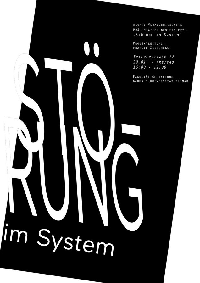 Der »Probelauf« der Studierenden im Studiengang Lehramt Kunsterziehung an Gymnasien präsentiert die Ergebnisse des Projektes »Störung im System«. Traditionell werden an diesem Tag auch die Alumni verabschiedet. Alle Interessierten sind herzlich ins ehemalige Steakhaus eingeladen.