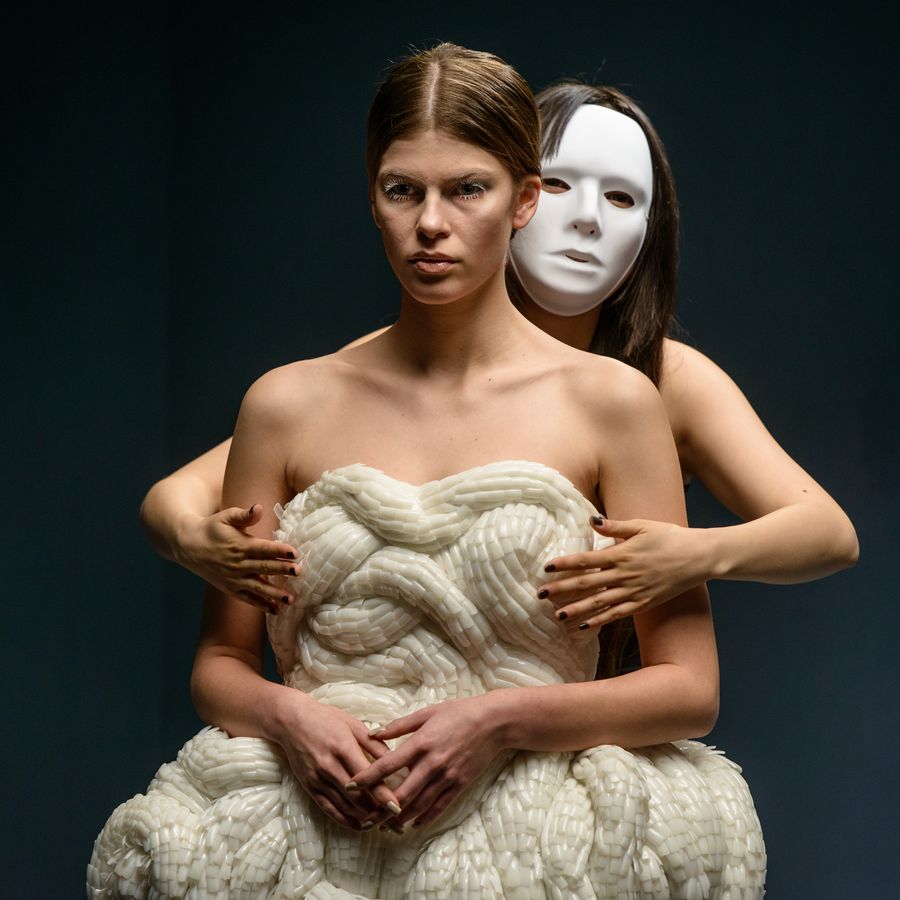 Für Lulin Wang, Studentin der Medienkunst/Mediengestaltung, ist es auf jeden Fall eine schöne Herausforderung, dabeizusein. Sie ist Teil des Projektes »Fashion Clips« bei Prof. Wolfgang Kissel, in dem Studierende für die Teilnehmer_innen des Design Awards in Apolda einminütige Imagefilme zu deren Modekollektionen erdenken und umsetzen – natürlich alles in enger Abstimmung mit den Designer_innen. Für Lulin und Pia kein Problem: »Pia ist eine exzellente Designerin und ich bewundere sie für ihre Ideen. Wir haben uns sofort gut verstanden und gemeinsam an dem Konzept für den Clip gearbeitet.« Ihr Beitrag greift die Geschichte der Modekollektion auf und bezieht sich auf innere Welten. Man sieht eine wunderschöne Frau, gehüllt in die schlangenartige Nagelkreation. Hinter ihr steht ein weiteres Mädchen mit einer weißen Maske. Es versteckt sich vor seinen eigenen Emotionen, ist aber gleichermaßen Symbol für die innere Gefühlswelt der Protagonistin. Der kurze Film wirkt geradezu klaustrophobisch. Erneut macht sich Frösteln breit.
