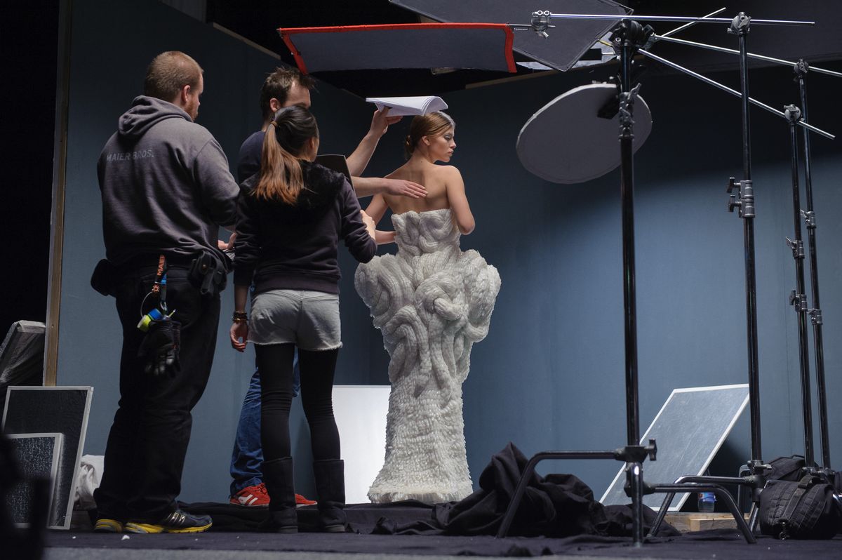 »Ruhe bitte! Wir drehen.« schallt es durch die Nivre Studios im Weimarer Westen. Als die gewünschte Ruhe eintritt, ist nur noch kühles Klappern zu vernehmen. Das Geräusch von geschichtetem Plastik. Acryl trifft auf Acryl. Die Ohren hören zuerst, was das Auge kaum glauben kann: ein voluminöses cremefarbenes Abendkleid – genäht aus 20.000 künstlichen Fingernägeln und ganze 6 kg schwer.