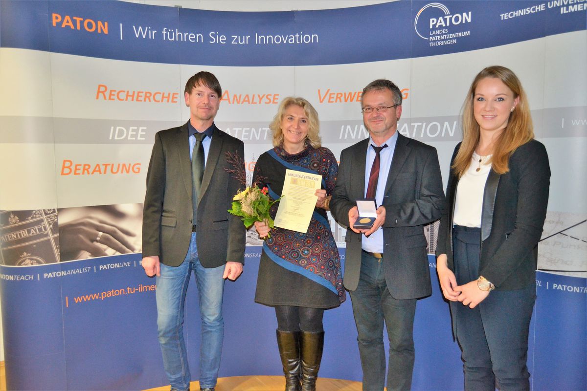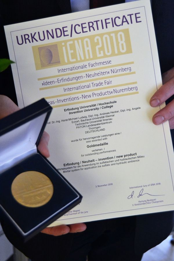 Die Erfinder- und Neuheitenausstellung iENA findet seit 1948 in Nürnberg statt. Innovationen von Thüringer Universitäten werden vor Ort vom Landes Patentzentrum Thüringen (PATON) vertreten. 2018 wurden insgesamt 15 Medaillen, darunter 9 Goldmedaillen, an Thüringer Innovatoren und Forschende überreicht. Neben der Goldmedaille zum Patent »Universelles Mörtelsystem für die Anwendung im sulfatischen und hydraulischen Milieu« erhielten die Weimarer Erfindungen »Seismische Tomographie zur Detektion von Staumauerschäden« (Prof. Dr. rer. nat. Tom Lahmer, M.Sc. Muyiwa Alalade, Prof. Dr.-Ing. Frank Wuttke) sowie »Ultraschall Beton- und Mörtelmischer« (M.Sc. Ricardo Remus, Dr. Christiane Rößler, Prof. Dr.-Ing. Horst Michael Ludwig) eine Ehrenurkunde.