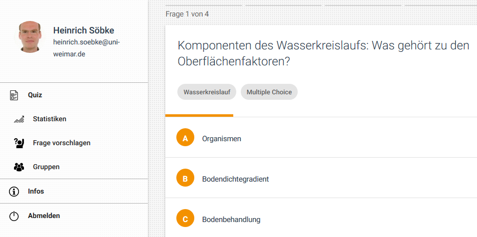 Spaß haben und dabei gleichzeitig lernen? Das geht: Anstatt Faktenwissen stur auswendig zu pauken, wiederholen Weimarer Studierende Lehrinhalte in dem von Prof. Dr. Jörg Londong geleiteten Kurs »Siedlungswasser-wirtschaft« mithilfe einer App. »Das Prinzip funktioniert ähnlich wie bei Quizduell«, berichtet Umweltingenieurstudent Christopher Rettschlag. »Zwei Studierende treten online gegeneinander an und messen ihr Wissen beispielsweise in der Kategorie Regenwasserbehandlung. Ziel ist es, möglichst viele Fragen innerhalb kürzester Zeit richtig zu beantworten und seinen virtuellen Gegner zu schlagen«.