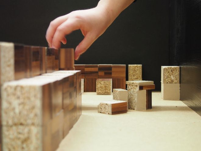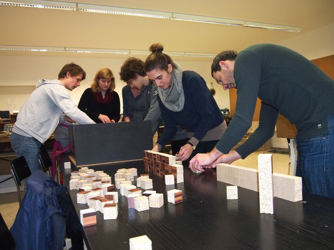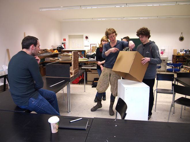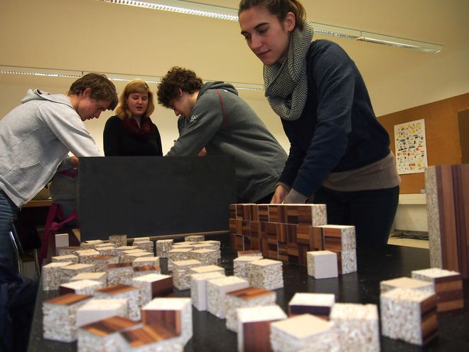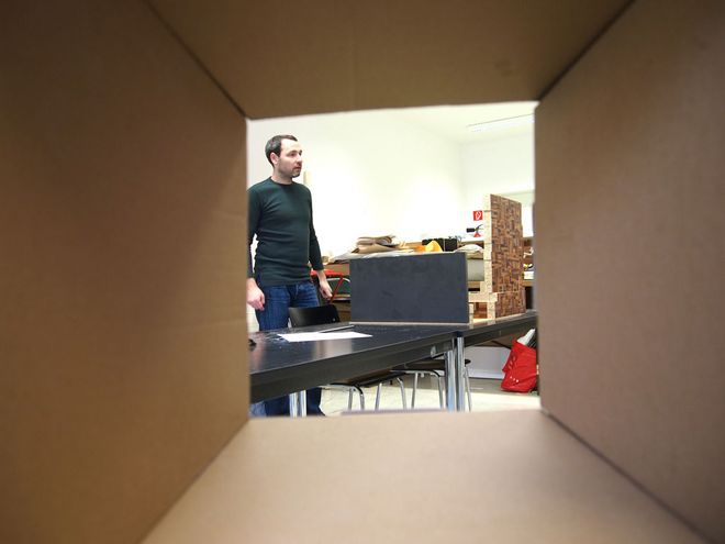 Das Konzept steht, genau wie das Modell. Es ist ein Messestand zu sehen, der aus hunderten kleiner Module besteht. Noch sind es kleine Holzklötze, für den echten Stand werden dann würfelförmige Module aus Pappkarton verwendet, die etwa die Größe eines Bierkastens haben. Das ressourcenschonende Material hat sich schon in den letzten Jahren bewährt. Die Kartons werden gestapelt und formen damit Wand, Tresen, Sitzgelegenheiten und Tische. Das diesjährige Konzept fußt dabei auf einer Konstruktion, die bereits im vergangenen Jahr entwickelt wurde, aber leider nicht umgesetzt werden konnte. Das vierköpfige interdisziplinäre Team aus Studierenden der Architektur und der Visuellen Kommunikation, bestehend aus Jonas Malzahn, Lars Nüthen, Robin Schlolaut und Lukas Beck, hatten die Pappmodule ursprünglich entworfen. Malzahn und Nüthen investierten nun für das nächste Projektteam weiter Schweiß und Arbeit, und entwickelten die Einzelmodule weiter und betreuten deren Fertigung bei der Firma Ilm-Pack.
