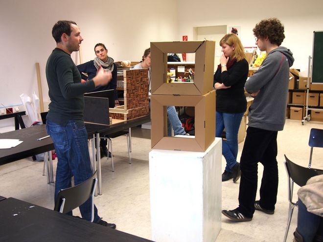 Die Pappwürfel dienen nicht nur als Bauteile für den Stand, sondern fungieren außerdem als Auslagemöglichkeit für die Bücher und nicht zuletzt als Lichtquelle: In einigen Modulen werden Lampen montiert, die durch Folien buntes Licht auf den Stand werfen. Die Lichtgestaltung des Messestandes ist auch dieses Jahr ein zentraler Aspekt der Konzeption. Im Rahmen des Projektes »Odyssee« fanden daher ein Fachkurs und ein Workshop statt, in denen sich die Studierenden dem Thema »Beleuchtung« näherten. In Frankfurt bei der Firma Erco experimentierten sie ganz praxisnah mit exklusiven Leuchten – im Workshop fertigten sie Leuchtkästen, die in Form und Größe genau in die Module aus Pappe eingepasst sind.