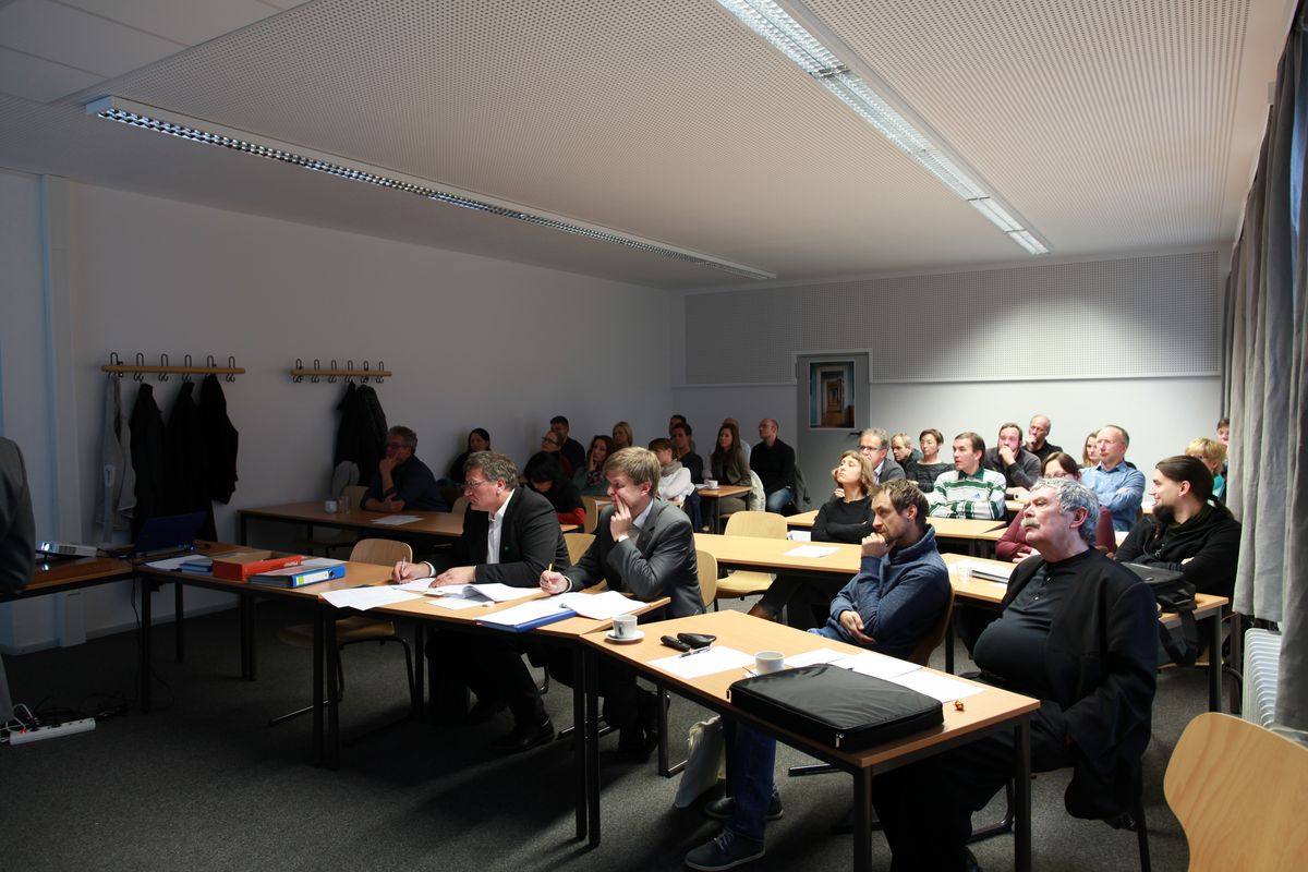 Vor 35 Zuhörern präsentierten die Studierenden ihre Arbeiten zu Themen wie Schalllängsdämmung oder sommerlicher Wärmeschutz, der auf Grund aktueller Änderungen gleich mehrfach Thema war. Bereits im Laufe des Jahres wurden Arbeiten zur bauphysikalischen Klassifizierung von Wandaufbauten bei Gründerzeithäusern, zur numerischen Modellierung druckentspannter Doppelfassaden und zu kritischen Anschlüssen bei Innendämmungen verteidigt. Neben der Betreuung durch Professoren und Mitarbeiter der Bauhaus-Universität konnte in diesem Rahmen auch die Zusammenarbeit mit auswärtigen Partnern intensiviert werden. So leisteten Herr Kehl (TU Dresden), Frau Dr. Park (Fraunhofer Institut für Bauphysik), und Prof. Pohlenz (ehem. FH Bochum) ebenso einen wichtigen Beitrag zur Betreuung der Masterkandidaten wie Prof. Kießl (ehem. BUW), der schon vor seiner Emeritierung aktiv im Studiengang mitgearbeitet hat.