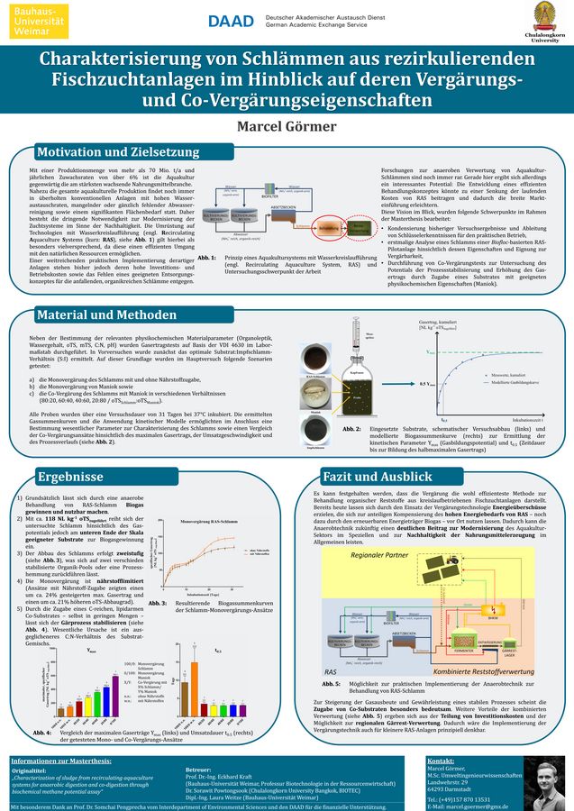 In seiner Masterarbeit, die an der Professur Biotechnologie in der Ressourcenwirtschaft in Kooperation mit der Chulalongkorn University Bangkok, Thailand während eines DAAD geförderten Auslandsaufenthalts erstelllt wurde, beschäftigte sich Marcel Görmer mit der "Charakterisierung von Schlämmen aus rezirkulierenden Fischzuchtanlagen im Hinblick auf deren Vergärungs- und Co-Vergärungseigenschaften". Die Arbeit wurde mit einem Poster und Präsentation der Juri des Instituts zur Förderung der Wassergüte- und Wassermengenwirtschaft e.V. vorgestellt.mehr