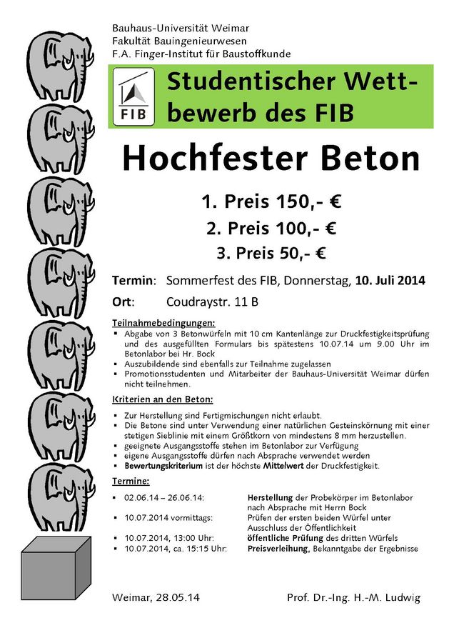 Teilnahmebedingungen: Abgabe von 3 Betonwürfeln mit 10 cm Kantenlänge zur Druckfestigkeitsprüfung und des ausgefüllten Formulars bis spätestens 10.07.14 um 9.00 Uhr im Betonlabor bei Hr. Bock