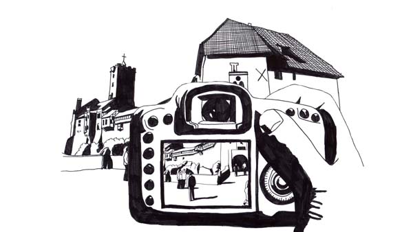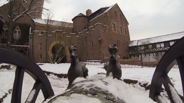 Die im vergangenen Wintersemester entstandenen Kurzfilme setzen sich beispielsweise mit der Frage auseinander, was eine Burg ist. Sie erzählen die Geschichte von Martin Luther und seiner Bibel-Übersetzung auf der Wartburg ebenso, wie die der heiligen Elisabeth, die ihren fürstlichen Reichtum an die Armen verteilte. Eine Zweikanal-Videoinstallation von Johannes Hensel und Andreas Sieling bebildert mit einem Augenzwinkern Mythen wie das Rosenwunder der Heiligen Elisabeth.