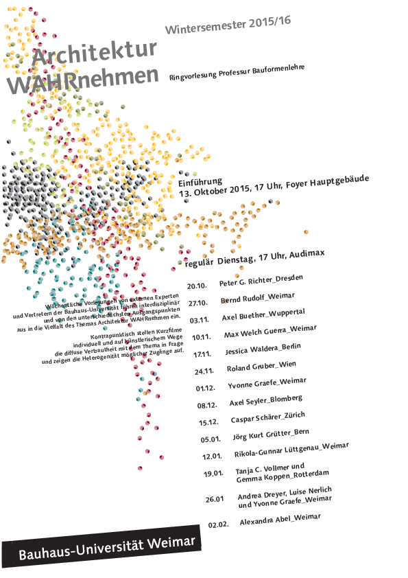 »Architektur WAHRnehmen« ist der Titel einer Ringvorlesung, zu der die Professur Bauformenlehre der Bauhaus-Universität Weimar jeweils dienstags 17 Uhr im Wintersemester 2015/16 einlädt. Sie richtet sich neben Studierenden aller Fachrichtungen ganz bewusst an alle Architektur-Nutzer.