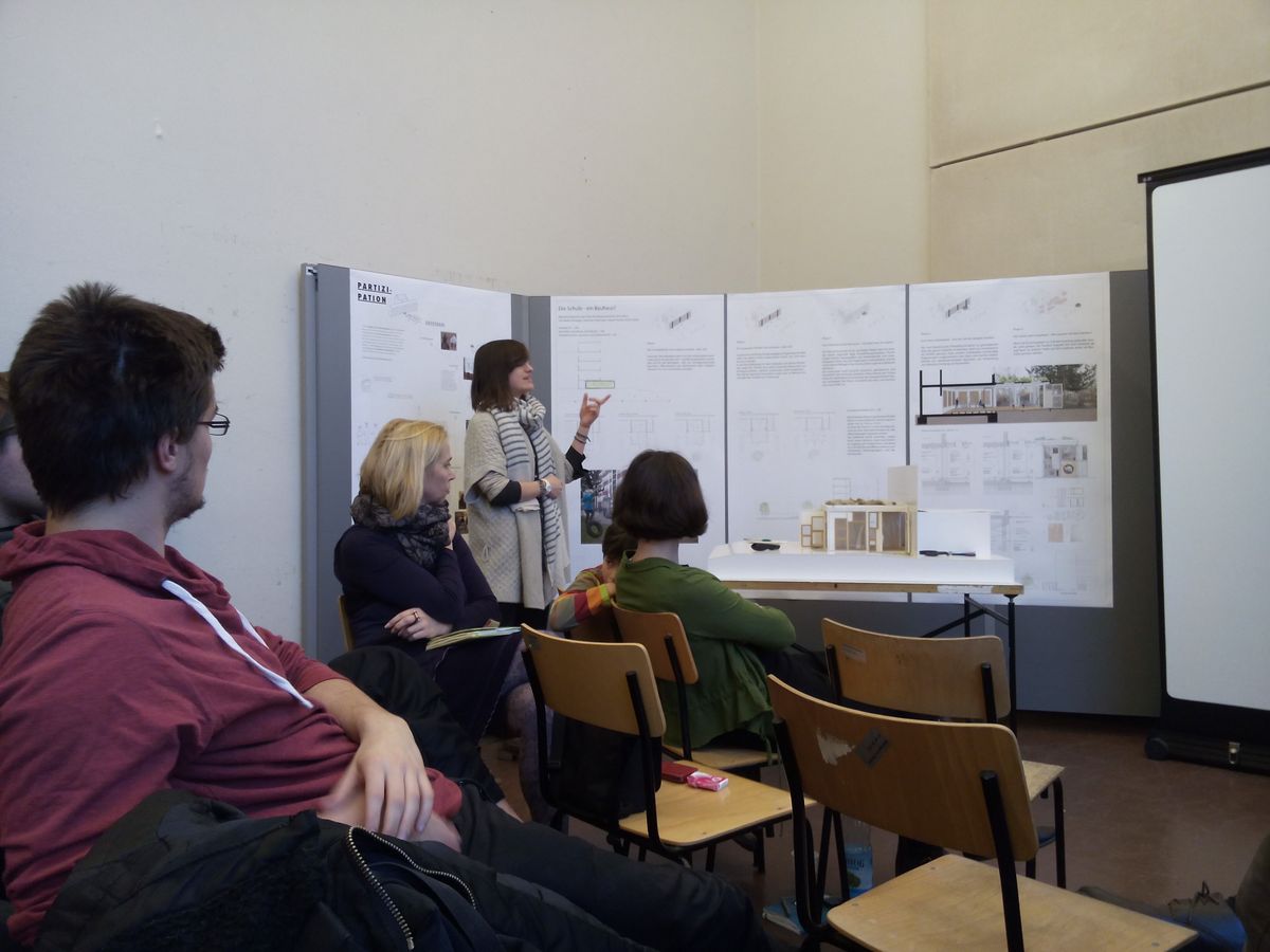 Denn: Schulumbau heißt Veränderung und diese Veränderung soll – dem Lernkonzept der Schule entsprechend – von allen Beteiligten mitgestaltet werden. Ein wichtiger Teil des Entwurfsprozesses war deshalb die Partizipation, also die Teilhabe aller Schulangehörigen, insbesondere der Schülerinnen und Schüler. So wurde zu Beginn des Wintersemesters in einer Projektwoche und im Kunstunterricht deren »Expertenwissen« gefordert. In den Experimentierwerkstätten bearbeiteten die Beteiligten gemeinsam die Themen Form, Funktion und Standort des Pavillons sowie die Geschichte des Schulgebäudes. Die darin gewonnenen Ideen brachten die Studierenden schließlich in ihre Entwürfe mit ein.