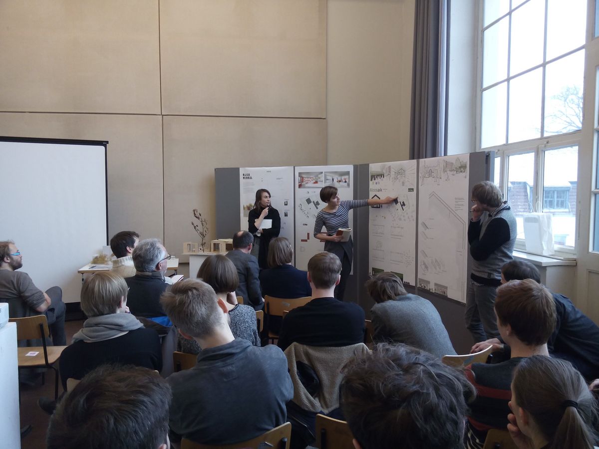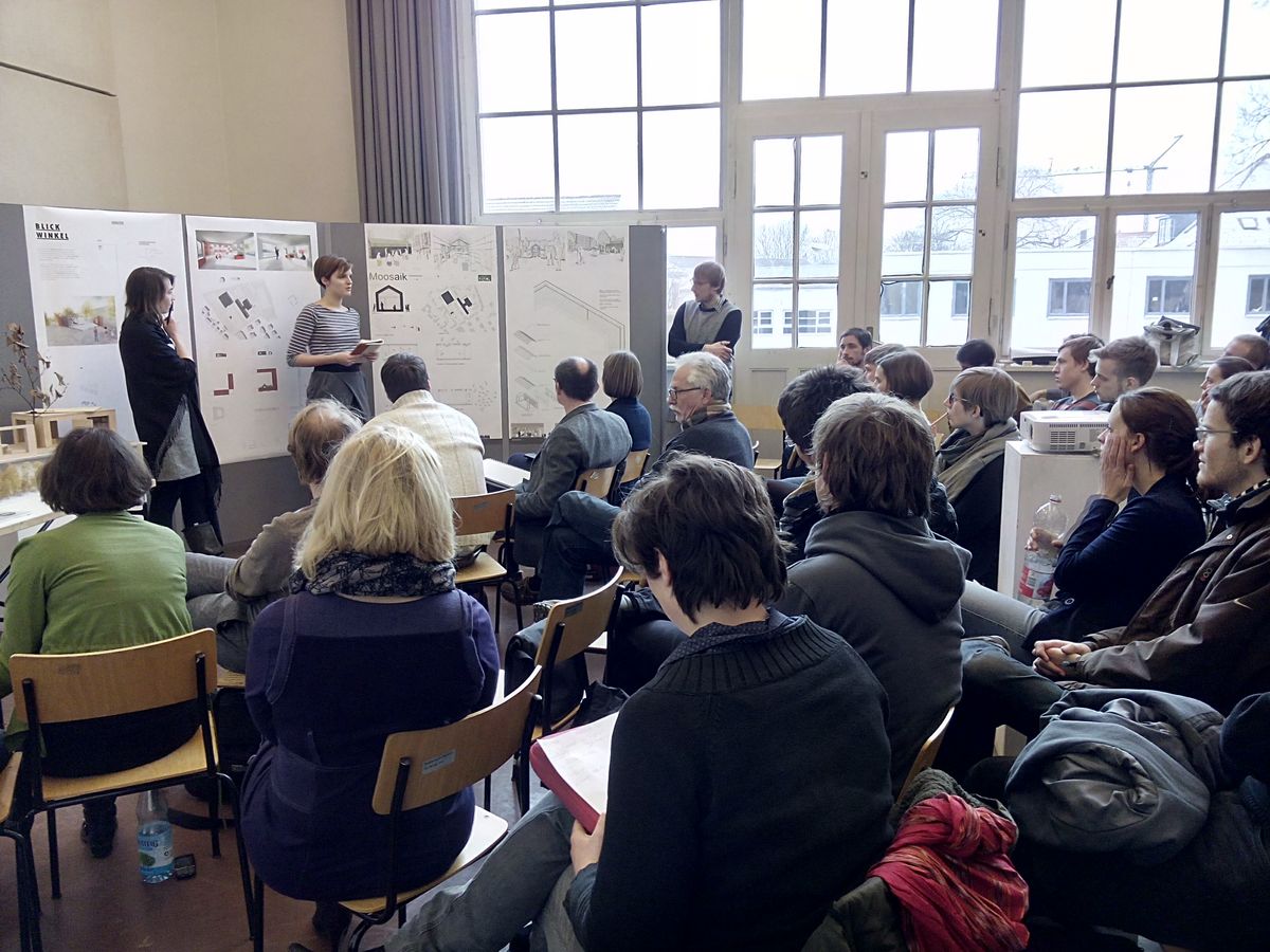 Letztlich entschied sich die Projektgruppe für den Entwurf »Moosaik«. Dieser erlaubt eine flexible Handhabung in der anstehenden Planungsphase und viel Spielraum zur gemeinsamen Umsetzung. Am 18. Februar 2015 werden die Studierenden den finalen Entwurf der Schulgemeinschaft vorstellen und für weitere Unterstützung werben, ehe er im Sommer umgesetzt wird. Im Sommersemester 2015 wird in Zusammenarbeit mit der Professur für Entwerfen und Tragwerkskonstruktion das Konzept des Siegerentwurfs weiter ausgearbeitet, wobei vor allem die Fragen nach den konstruktiven Prinzipien, Brandschutz und Materialwahl final beantwortet werden.