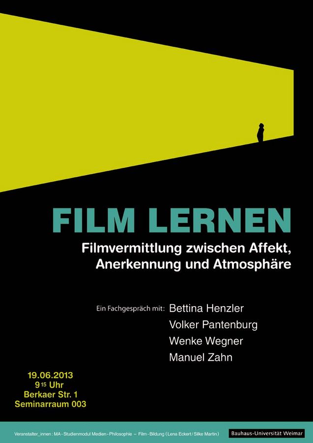Die Veranstaltung wird im Rahmen des Master-Studienmoduls »Medien-Philosophie - Film-Bildung« unter der Leitung von Dr. Silke Martin und Dr. Lena Eckert veranstaltet.