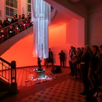 Nach ihrer mutwilligen Beschädigung im Februar 2016 und ihrer erfolgreichen Restaurierung in der Werkstatt von Ilja Streit wurde die »Eva« im Rahmen einer feierlichen Zeremonie an dem ihr angestammten Platz im Hauptgebäude der Bauhaus-Universität Weimar empfangen. Der Einladung zur Veranstaltung waren zahlreiche Besucherinnen und Besucher aus der universitären und der Weimarer Öffentlichkeit gefolgt. Die Enthüllung der »Eva« wurde unter Begleitung von Musik und Licht im Hauptgebäude feierlich inszeniert. »Das ist ein besonderer Moment für unsere Universität.«, eröffnete Prof. Dr. Winfried Speitkamp, Präsident der Bauhaus-Universität Weimar, in seinem Grußwort. »Der Akt der Gewalt und der betonten Missachtung, der ihr im Jahre 2016 widerfahren musste, hat große Solidarität und Unterstützung hervorgerufen. Mein großer Dank gilt daher allen, die sich bei der Restaurierung engagiert haben, an erster Stelle natürlich denjenigen, die durch ihre Spende die Restaurierung möglich gemacht haben. Besonderer Dank gilt dem Ehepaar Thomas und Birgit Rabe, die durch eine beträchtliche Spende den Großteil zur Finanzierung der Restaurierung beigetragen haben«, so Speitkamp.