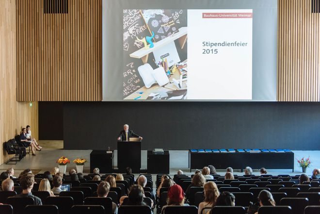 Im Audimax der Bauhaus-Universität Weimar kamen am Donnerstag, 4. Juli 2015, Stipendiatinnen und Stipendiaten, Fördererinnen und Förderer sowie viele Gäste zusammen, um die Vergabe der Stipendienurkunden des aktuellen Studienjahrs zu feiern. Über 70 Studierende, Promovierende und Postdocs der Bauhaus-Universität Weimar werden im kommenden Jahr in ihrem Studium und bei ihren herausragenden Forschungs- und Kunstprojekten unterstützt.