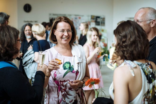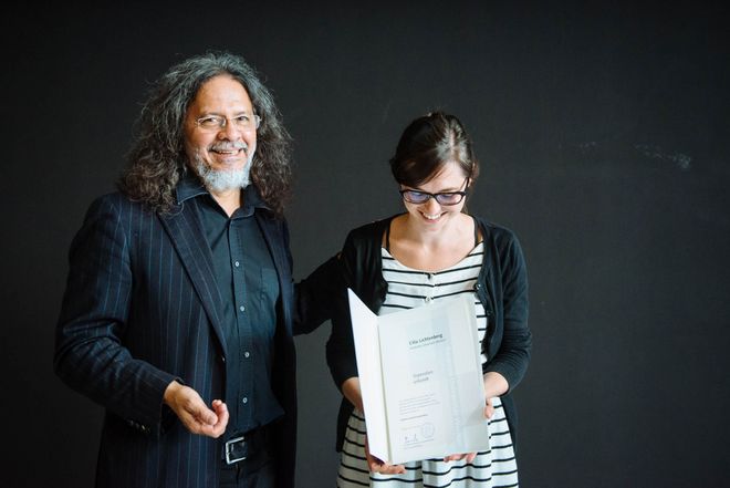 Wer an der Bauhaus-Universität Weimar nach einem Studienabschluss im Rahmen einer Promotion forscht, kann sich für weitere Stipendien bewerben. Die Gleichstellungsbeauftragte Britta Trostorff erläuterte die Möglichkeiten des Chancengleichheit Wiedereinstiegsstipendiums für Doktorandinnen und Doktoranden, die ihre Arbeit für eine Familienpause unterbrechen. Seit Sommer 2014 konnte so vier Promovierenden der Wiedereinstieg in die Promotion erleichtert werden. Das diesjährige Chancengleichheit Stipendium für Künstlerinnen/Gestalterinnen erhält Grit Ruhland von der Fakultät Gestaltung für ihr Ph.D.-Projekt »Folgelandschaften«. Eine Stipendienurkunde erhielten ebenso die bei der Feier anwesenden Stipendiatinnen der Sonderausschreibung aus dem vergangenen Jahr. Eine der Stipendiatinnen, Anne Brannys, präsentierte im Anschluss den Arbeitsstand ihres Promotions- und Ausstellungsprojekts »Über das Zarte« und lud ein, einen Blick in ihre »Enzyklopädie des Zarten« bei der Stipendienausstellung »Ausgewählt« zu werfen.