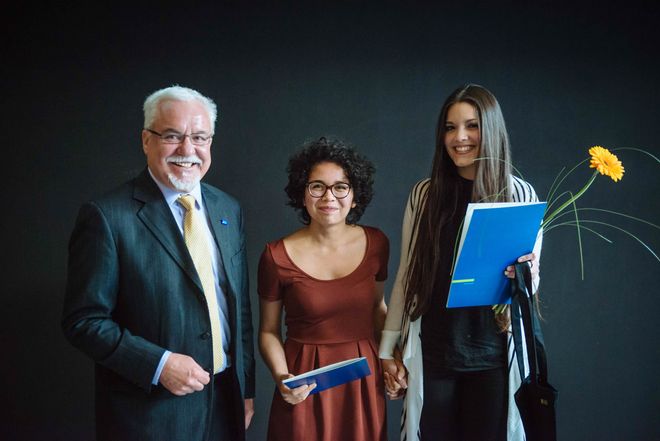 Prof. Max Welch Guerra, der im Anschluss die Urkunden für die Studierendenstipendien überreichte, betonte, welchen besonderen Wert die Stipendien für die Universität haben und welche Auszeichnung die Ehrung gleichzeitig auch für alle Angehörigen der Universität ist. Die Urkunden der Bauhaus-Stipendien erhielten sieben Studierende mit überdurchschnittlichen Studienleistungen, die sich außerdem durch interdisziplinäre Interessen und ihr nachhaltiges Engagement für die Universität auszeichnen, zum Beispiel in Gremien wie dem StuKo, der Universitätsgalerie marke.6 oder der Initiative für Flüchtlinge Weimar.