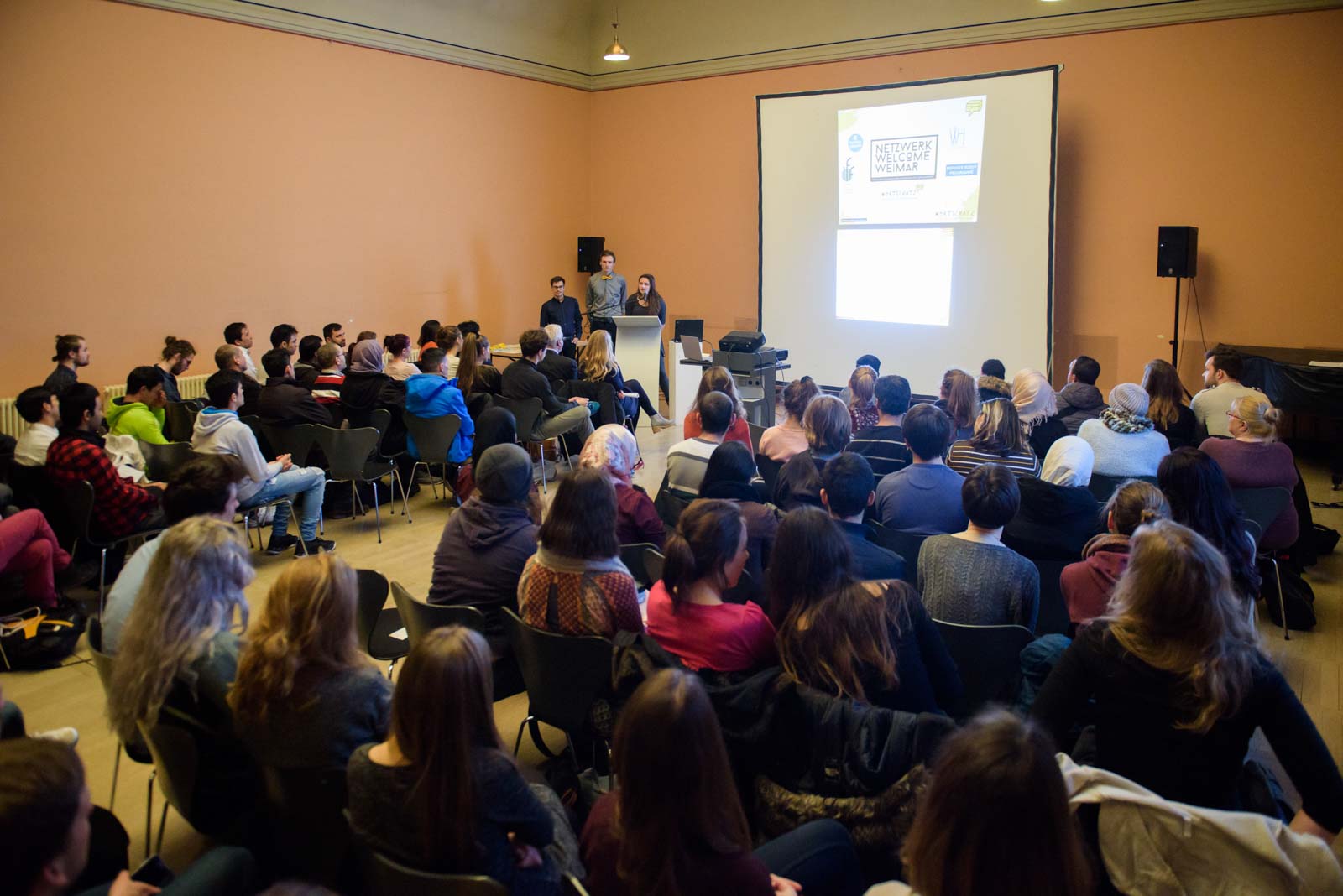Inzwischen ist ein enges Netzwerk von Studierenden und Geflüchteten gewachsen, das Netzwerk »Welcome Weimar« mit einem eigenen Büro in der Marienstraße 7. Die vielfältigen Angebote der studentischen und ehrenamtlichen Initiativen, von kreativen und informativen Workshops, regelmäßigen kulturellen Abenden der »Initiative für Flüchtlinge« (IfF) bis hin zum »Refugee Buddy Programme« für Tandem-Paare schaffen einen Raum, in dem sich Studierende und Geflüchtete begegnen und durch kulturelle Gemeinsamkeiten und Unterschiede voneinander und miteinander lernen.