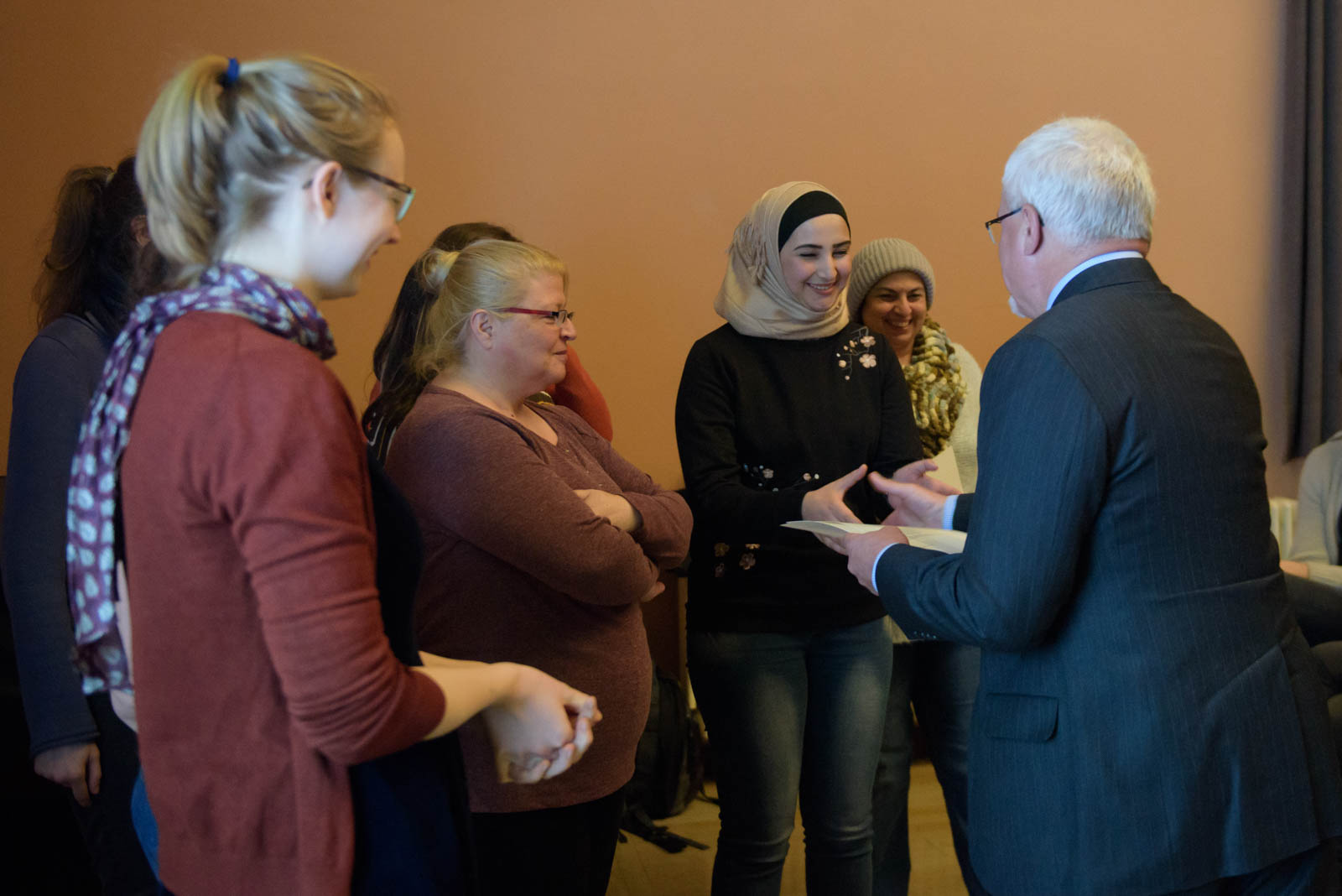 Bereits zum dritten Mal überreichte der Rektor der Bauhaus-Universität Weimar, Prof. Dr.-Ing. Karl Beucke, Zertifikate an die Teilnehmerinnen und Teilnehmer der Sprachkurse für Geflüchtete. Mit der Veranstaltung im Oberlichtsaal am Freitag, 3. Februar 2017, fand ein weiteres Semester engagierter studentischer Flüchtlingsarbeit einen feierlichen Abschluss.