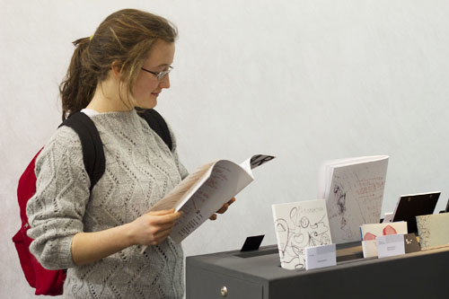 Kein Wunder, dass das Interesse groß ist, die ausgestellten Arbeiten sind allesamt eine intensive Lektüre oder Betrachtung wert. Neben studentischen Publikationen wie der Port, dem Horizonte-Magazin oder der Medienkultur-Zeitschrift Eject, werden viele Diplom- und Bachelorarbeiten der Visuellen Kommunikation sowie Postkarten, Anstecker, Schmuck und andere selbstproduzierte Produkte präsentiert – auf eigens entworfenen und gebauten Möbeln.