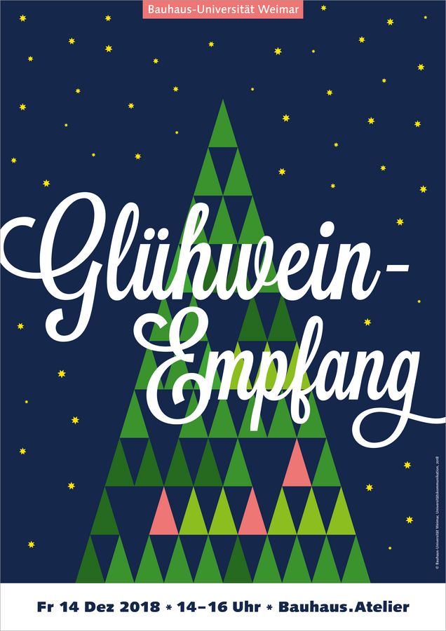 Am 14. Dezember 2018, 14 bis 16 Uhr, lädt Präsident Prof. Dr. Winfried Speitkamp alle Mitglieder der Universität, alle Kolleginnen und Kollegen aus dem Gewährleistungsbereich sowie aus allen Fakultäten der Bauhaus-Universität Weimar zu einem Glühweinempfang im Bauhaus.Atelier ein.