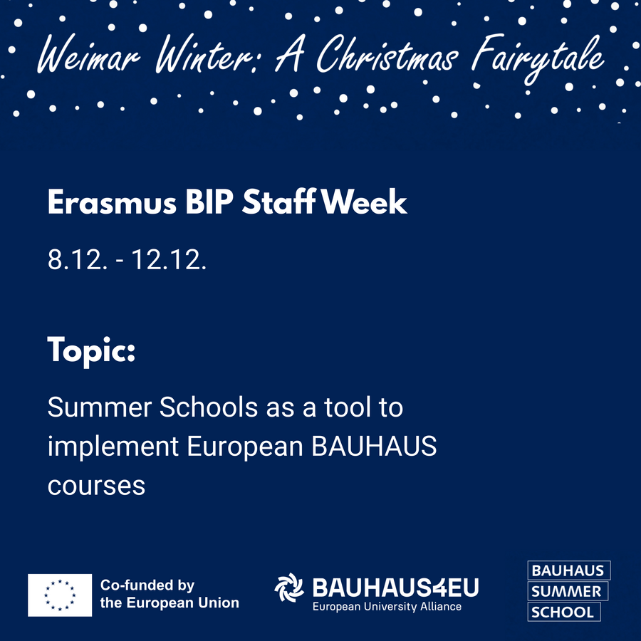Zum Jahresende veranstaltet die Hochschulallianz BAUHAUS4EU (B4EU) gemeinsam mit der Bauhaus Summerschool eine Staff Week: Vom 8. bis 12. Dezember kommen rund 30 Mitarbeitende aus allen zehn Partneruniversitäten sowie der ukrainischen Kharkiv National University of Economics nach Weimar an die Bauhaus-Universität. Unter dem Titel »Summerschools als Instrument zur Umsetzung europäischer BAUHAUS-Kurse« beschäftigt sich das Workshopprogramm mit Formaten internationaler Kurzzeitprogramme.