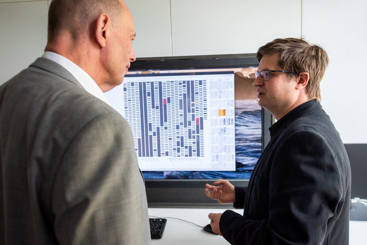 Aus dem Themenbereich »Visual Analytics« stellten die Medieninformatiker darüber hinaus zwei aktuelle Projekte vor, in denen es um die Analyse besonders umfangreicher Datensätze geht. Ein Projekt, das in Zusammenarbeit mit der Firma Kohlhaas & Kohlhaas GbR aus Weimar durchgeführt wurde, visualisiert beispielsweise das gesamte Opus des Denkers und Philosophen Bazon Brock, wie Dr. Patrick Riehmann, Mitarbeiter der Arbeitsgruppe »Virtual Reality and Visualization Research«, an einem Großbildschirm aufzeigt. Um sich in dem umfangreichen Werk des Philosophen besser orientieren zu können, wurden verschiedene Detail- und Übersichtsdarstellungen mit einer interaktiven Suchtechnologie kombiniert. »Die visuelle Aufbereitung des Werkes Brocks, welches sich über mehrere Jahrzehnte erstreckt, kann uns helfen, Einschätzungen oder Standpunkte verschiedener Philosophen oder Schriftsteller unkompliziert zugänglich zu machen. Derzeit arbeiten wir die Werke von Goethe und Schiller auf, was die Anwendung sicherlich auch für Bildungsinstitute interessant macht«, berichtet Riehmann.
