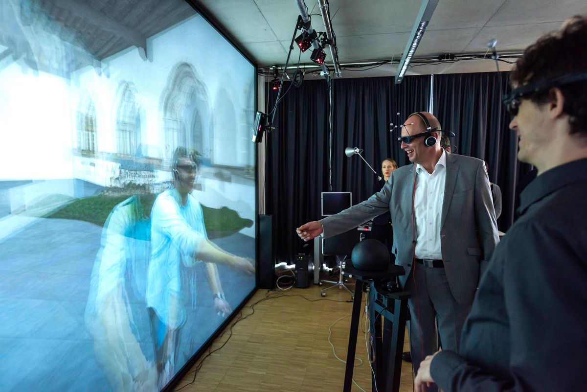 Die Medieninformatiker Dipl.-Med.-Sys.-Wiss. André Kunert und Dr. Alexander Kulik der Bauhaus-Universität Weimar demonstrierten dem Minister anhand des »stereoskopischen Mehrbenutzer-Systems« im Digital Bauhaus Lab, wie sich Menschen zukünftig in fiktiven virtuellen Welten begegnen und austauschen könnten. »Das Ziel ist, möglichst vielen Nutzern zu ermöglichen, über Entfernung in Interaktion miteinander zu treten. Das Mehrbenutzersystem im Digital Bauhaus Lab ist derzeit weltweit einzigartig, da es bis zu sechs Nutzer gleichzeitig unterstützt«, berichtet André Kunert, Mitarbeiter der Arbeitsgruppe »Virtual Reality and Visualization Research«.