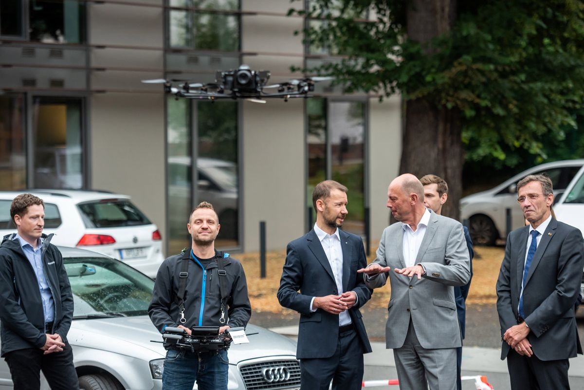 »Unsere Vision sind hoch automatisierte digitale Erfassungs- und Auswertungsverfahren für Bauwerksdaten, um den Zustand von Bestandsbauwerken zukünftig effizienter und robuster ermitteln und Interventionsmaßnahmen fundierter planen zu können«, so Morgenthal. Wie die Schwebeplattform dabei helfen kann, präsentierte der Wissenschaftler dem Minister zusammen mit seinen Mitarbeitern im Anschluss bei einem vollständig automatisierten Flug der Drohne um das Digital Bauhaus Lab.