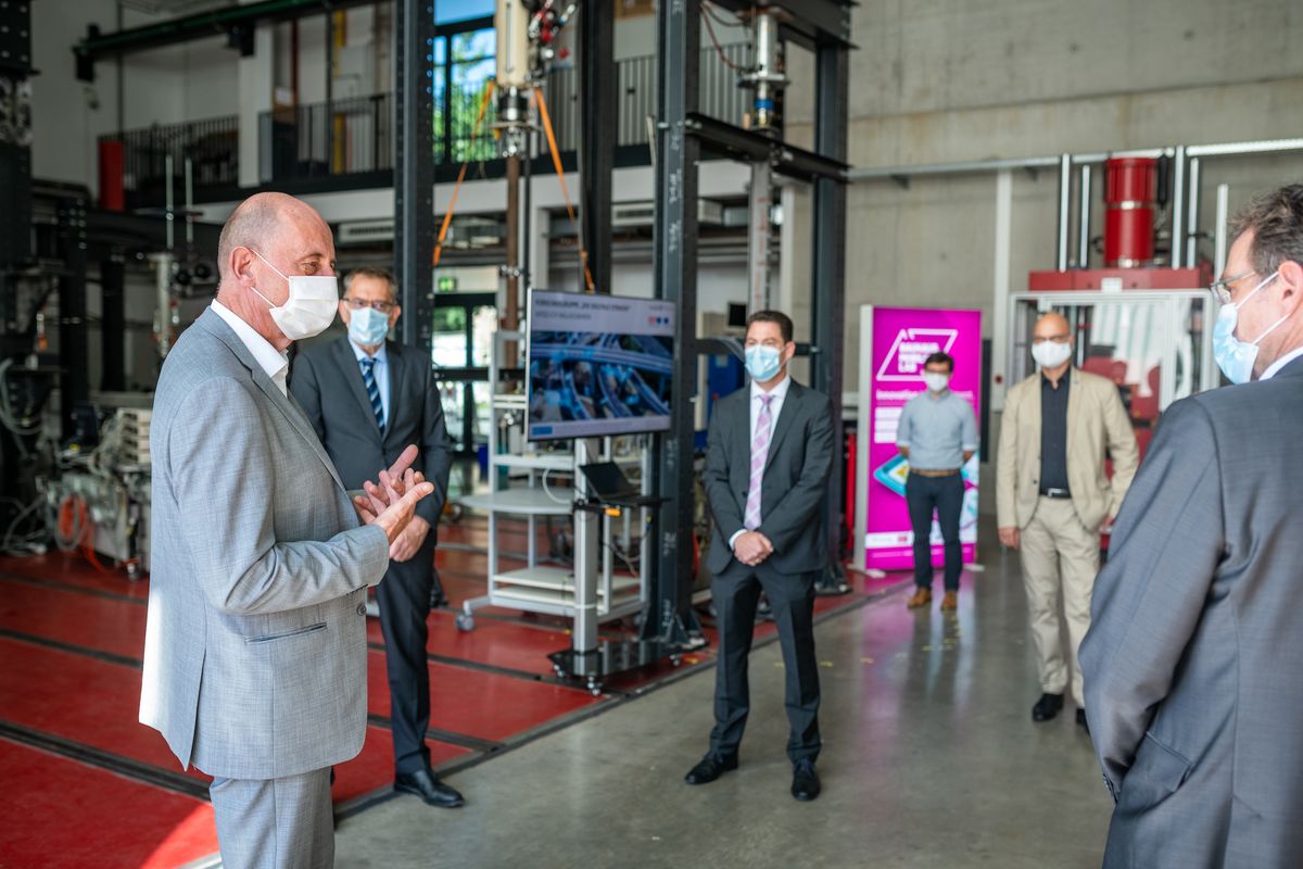 Wie darüber hinaus die Zusammenarbeit von Wissenschaft und Wirtschaft in der Praxis aussieht, wurde beim anschließenden Besuch in der Versuchstechnischen Einrichtung der Bauhaus-Universität Weimar deutlich. Hier erhielt Minister Tiefensee Einblick in aktuelle Forschungsergebnisse zum Thema »Digitalisierung des Straßenverkehrs«: Ziel der an der Fakultät Bauingenieurwesen angegliederten Forschergruppe ist die digitale Vernetzung von Verkehrsteilnehmenden, Fahrzeugen und der sie umgebenden Infrastruktur. Mithilfe energieautarker, intelligenter Mikro-Sensoren (MEMS), welche in Straßen und Brücken verbaut werden sollen, könnten Verkehrs-, Umwelt- und Zustandsdaten der Bauwerke zukünftig dezentral erfasst und in Echtzeit an Verkehrsmanagementzentralen und Fahrzeuge übermittelt werden. Dadurch könnten Verkehrsfluss und Sicherheit optimiert sowie Umweltbelastungen reduziert werden – davon sind die Weimarer Wissenschaftlerinnen und Wissenschaftler um Prof. Dr.-Ing. Uwe Plank-Wiedenbeck (Professur Verkehrssystemplanung), Prof. Dr.-Ing. Matthias Kraus (Professur Stahl- und Hybridbau) und Prof. Dr.-Ing. Kay Smarsly (Professur Informatik im Bauwesen) überzeugt. Gleichzeitig würden Schäden maroder Infrastruktur frühzeitig erkannt und somit Instandsetzungskosten minimiert, so die Prognose der Forschergruppe »Die digitale Straße«. In dem von der EU, dem Thüringer Ministerium für Wirtschaft, Wissenschaft und Digitale Gesellschaft sowie der Thüringer Aufbaubank geförderten Projekt wurden daher nicht nur Grundlagen für das hoch-automatisierte und autonome Fahren geschaffen, sondern zugleich wirksame Verkehrsmanagementstrategien erprobt, um Emissionen zu reduzieren und die Lebensdauer der Infrastruktur zu erhöhen.
