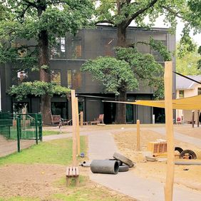 In dem dreigeschossigen Holzbau auf dem südlichen Teil des Campus der Bauhaus-Universität in unmittelbarer Nachbarschaft eines bereits vor einigen Jahren dort eingerichteten Kita-Gebäudes haben bis zu 60 Kinder Platz. Der bereits angelegte Spielgarten konnte im Außengelände entsprechend der geltenden Vorschriften erweitert werden. Im neu errichteten Haus werden Kinder frühestens ab dem zweiten Lebensjahr bis zum Schuleintritt betreut. Durch die barrierefreie Ausstattung aller Räume sowie den Personenaufzug können sich auch Kinder mit Beeinträchtigungen im gesamten Haus frei bewegen. Zudem gibt es verschiedene Funktionsräume, welche die Kinder nach ihren Bedürfnissen nutzen können: ein Atelier, eine Mediathek, ein Rollenspielraum, einen Bewegungsraum, in dem auch musiziert werden kann, einen Bauraum, eine Lernwerkstatt und ein Therapieraum, der zusätzlich als Rückzugsraum dienen kann.