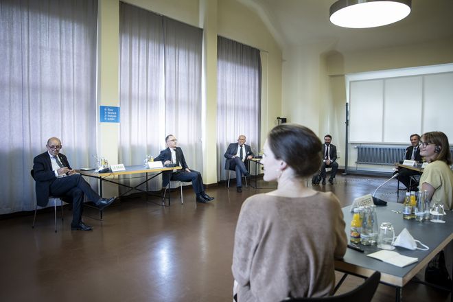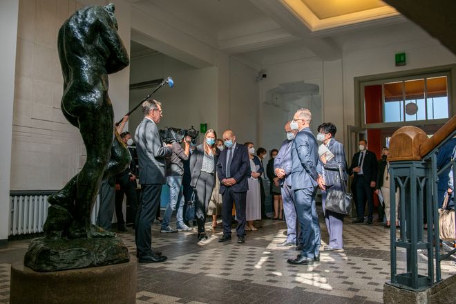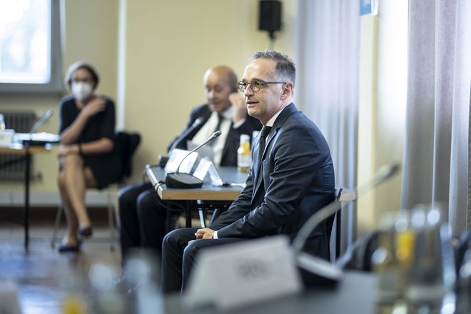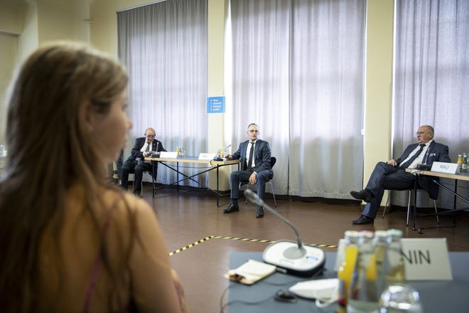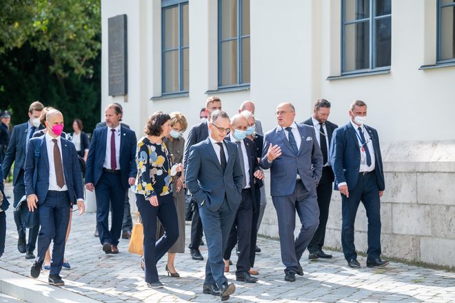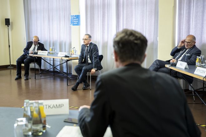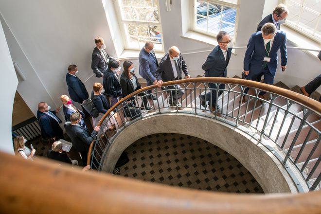 Das anschließende Arbeitstreffen der drei Politiker fand auf dem Campus der Bauhaus-Universität Weimar statt. Im Foyer des Hauptgebäudes begrüßte Universitätspräsident Prof. Dr. Winfried Speitkamp die drei Minister und betonte in seiner Begrüßung die herausragende Bedeutung von Internationalität an diesem historischen Ort – angefangen von der Weimarer Kunstschule im 19. Jahrhundert über das Staatliche Bauhaus in den 1920er Jahren bis hin zur heutigen Bauhaus-Universität Weimar. Der Oberlichtsaal bot dann Raum für die Arbeitsgespräche zwischen Heiko Maas und seinen Amtskollegen.