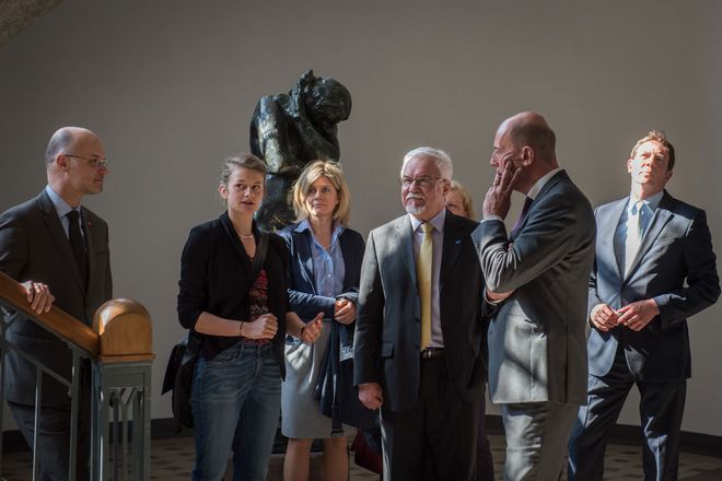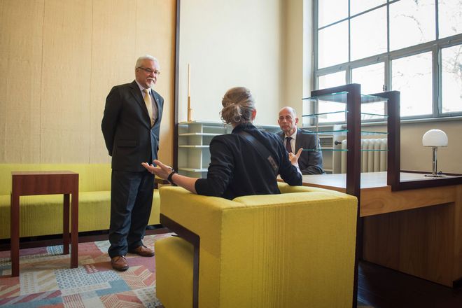 Auf dem Weg zum StudierendenKonvent (StuKo) der Bauhaus-Universität Weimar führte eine Architekturstudentin den Minister unter anderem durch das Herzstück des Hauptgebäudes, das Gropiuszimmer, und erläuterte dort Gropius' Gesamtkunstwerk ebenso wie Details zum Bauhaus und aus der Geschichte der Universität. Die »Eva« von August Rodin im Hauptgebäude-Foyer bezeichnete Tiefensee als einen »Schatz«, den die Bauhaus-Universität Weimar hier an prominenter Stelle berge.