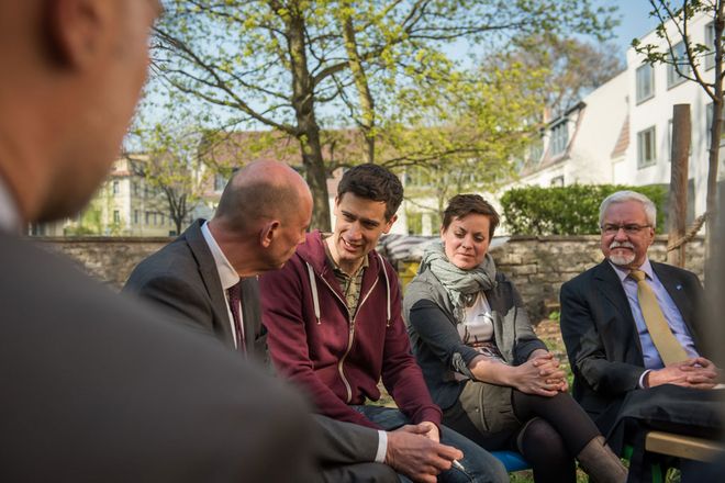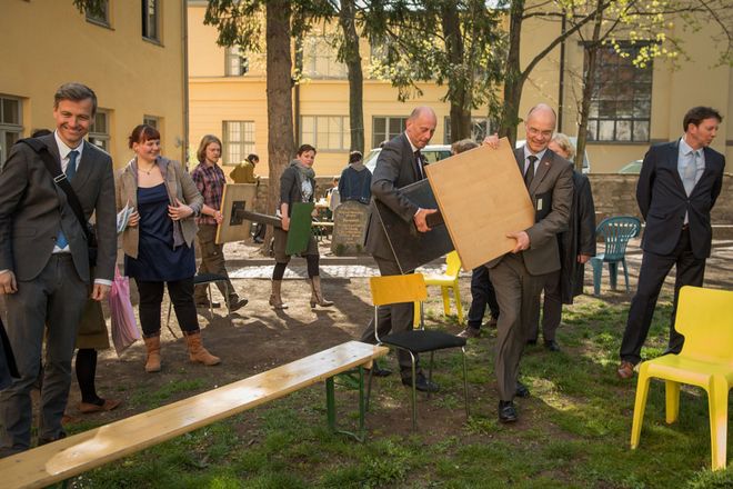 Im Studierendenhaus M18, in dem auf Wunsch des Ministers ein Treffen mit studentischen Vertreterinnen und Vertretern geplant war, entschieden die Studierenden gemeinsam mit Tiefensee kurzerhand, die Gesprächsrunde aufgrund des herrlichen Frühlingswetters in den Garten zu verlegen. Tiefensee eröffnete die Runde mit dem Bekenntnis, dass er ein großer Fan des Seifenkistenrennens sei und sprach mit den Studierenden über ihre Sorgen und Wünsche. So fragte eine StuKo-Vetreterin nach dem Stellenabbau im Rahmen des STEP und damit verbundene Auswirkungen auf die Lehr- und Betreuungssituation. Der Minister ging ausführlich auf die Hintergründe ein, etwa wie das Land mit den Kennzahlen des Hochschulpaktes 2020 umgehen müsse und warum es dafür eigens Rücklagen gebildet habe.