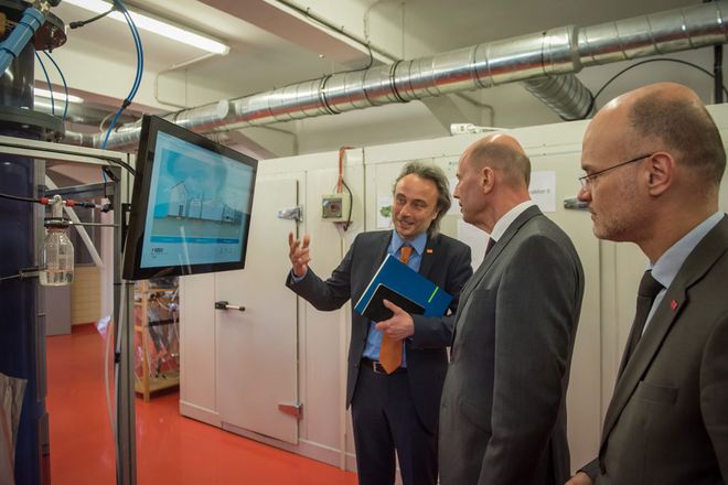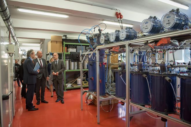 In der Coudraystraße traf der Wissenschaftsminister auf dort tätige Professorinnen und Professoren, die ihn durch ihre Gebäude führten und ihm das Labor der Professur »Biotechnologie in der Ressourcenwirtschaft« vorstellten, das derzeit von vier Professuren, unter der Leitung von Prof. Kraft, innerhalb des Bauhaus-Instituts für zukunftsweisende Infrastruktursysteme (b.is) genutzt wird. Die Beteiligten zeigten auf, in welchen Forschungszusammenhang die zukünftige Exzellenz-Professur »Technologien urbaner Stoffströme« eingebettet sein wird. Diese wird durch das Land Thüringen im Programm "ProExzellenz" gefördert und soll in Kürze ihre Arbeit aufnehmen. Außerdem informierte Prof. Ludwig, Leiter des F.A. Finger-Instituts für Baustoffkunde, über den Forschungsschwerpunkt Material und Konstruktion. Prof. Witt, Leiter der Professur Grundbau, gab zudem Einblick in seine Forschungsaktivitäten.