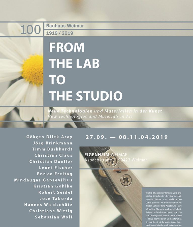 In Kooperation mit der Bauhaus-Universität Weimar präsentiert die Galerie EIGENHEIM künstlerische, gestalterische sowie wissenschaftliche Positionen von Studierenden, Mitarbeitenden und Alumni, die sich mit zeitgenössischen Fragestellungen auseinandersetzen. »FROM THE LAB TO THE STUDIO« thematisiert neue Möglichkeiten der Technologie und von Materialien in der Kunst und untersucht die damit einhergehenden Hoffnungen, Herausforderungen sowie Lösungen für die Zukunft.