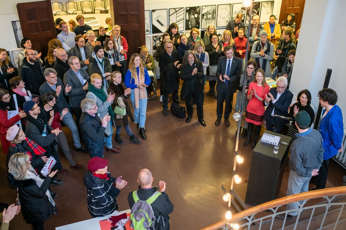 Zu diesem Anlass wurde außerdem eine Ausstellung mit Fotografien von Samuel Solazzo und Jannis Uffrecht eröffnet: Die beiden Fotografen begleiteten die zahlreichen Veranstaltungen des Jubiläumsjahres an der Bauhaus-Universität Weimar mit der Kamera und lieferten so auch den visuellen Rahmen für das Buch. 100 ihrer Schwarzweißfotografien sind noch bis zum 31. Januar 2020 im Hauptgebäude zu sehen.