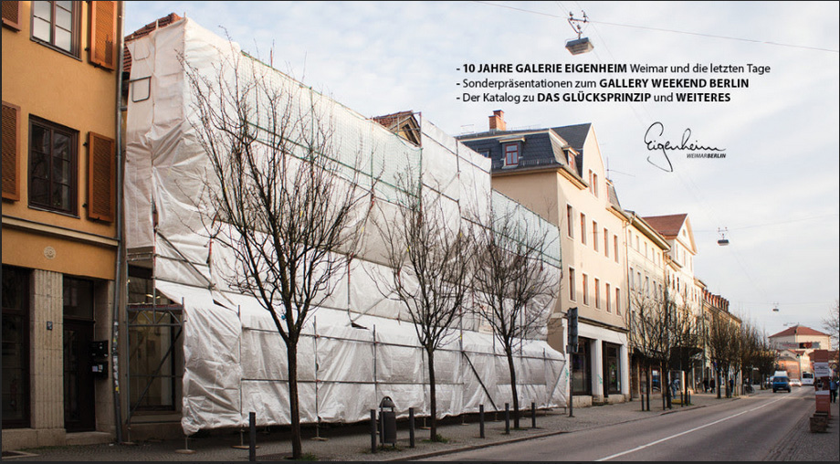 Die Galerie Eigenheim öffnete zehn Jahre lang ihre Türen für zeitgenössische Kunst und Künstler in der Karl-Liebknecht-Straße 10 in Weimar. Zahlreiche Absolventen der Bauhaus-Universität Weimar fanden hier Räume zum Experimentieren und um ihre Ideen verwirklichen zu können. Auf den Tag genau zehn Jahre nach der Eröffnung verlässt die Galerie nun ihre Räumlichkeiten und zieht innerhalb der Stadt um. Am Samstag, 23. April 2016, wird der Abschied ab 21 Uhr mit einem großen Fest gefeiert.
