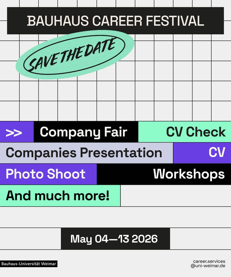 Vom 4. bis 13. Mai 2026 veranstaltet die Bauhaus-Universität Weimar erstmals das Bauhaus Career Festival. Die neue Veranstaltungsreihe richtet sich an Studierende, Absolvent*innen und internationale Talente und verbindet Workshops, digitales Matching und eine Firmenkontaktmesse zu einem vielseitigen Angebot rund um den Berufseinstieg.