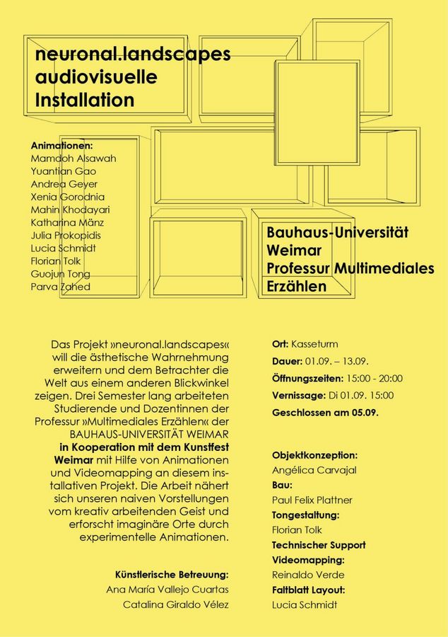 Das Projekt »neuronal.landscapes« will die ästhetische Wahrnehmung erweitern und dem Betrachter die Welt aus einem anderen Blickwinkel zeigen. Drei Semester lang arbeiteten Studierende und Dozentinnen der Professur »Multimediales Erzählen« der BAUHAUS-UNIVERSITÄT WEIMAR mit Hilfe von Animationen und Videomapping an diesem installativen Projekt. Die Arbeit nähert sich unseren naiven Vorstellungen vom kreativ arbeitenden Geist und erforscht imaginäre Orte durch experimentelle Animationen.