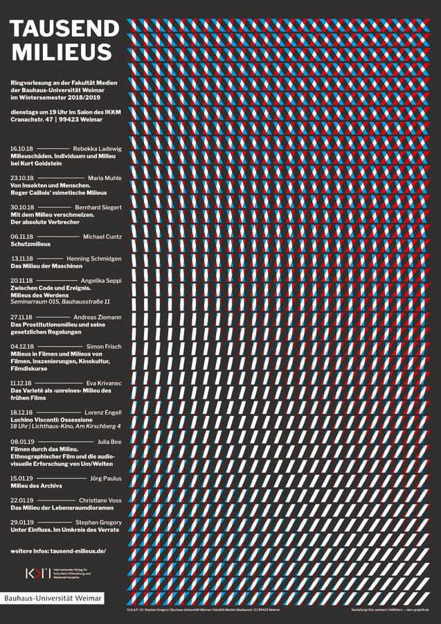 Der Begriff des Milieus hat eine wechselvolle Geschichte, die sich immer wieder mit der des Medienbegriffs überkreuzt hat, sowohl auf dem Feld der Biologie und Ökologie, als auch dem der Soziologie und der Technikgeschichte. Daher will die Ringvorlesung den Milieubegriff nicht vorschnell definitorisch einengen oder als neues Masterkonzept für die Medienwissenschaften reklamieren. Wie der Titel »Tausend Milieus« andeutet, geht es vielmehr darum, aus einer größtmöglichen Zahl von unterschiedlichen Perspektiven danach zu fragen, was das Denken in Milieus auf unterschiedlichen Feldern des Wissens geleistet hat – und was von ihm für medienwissenschaftliche Fragestellungen erwartet werden kann.