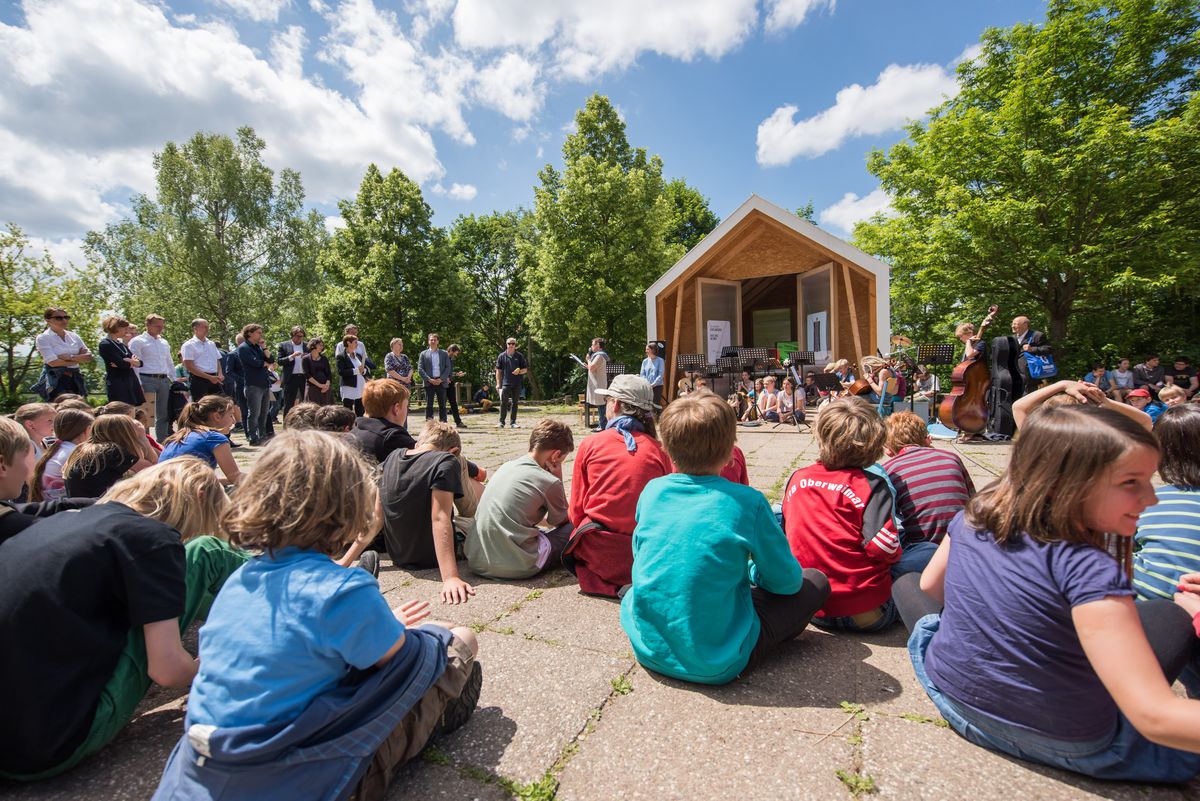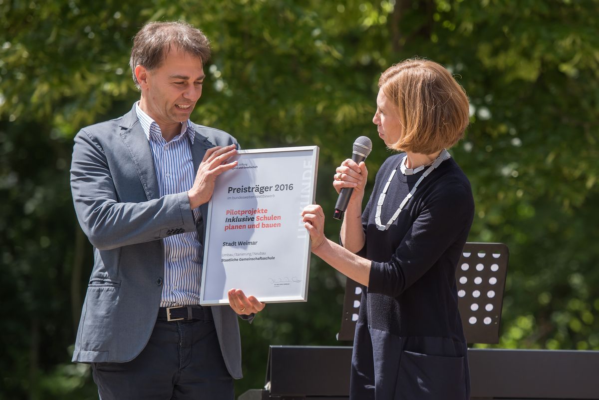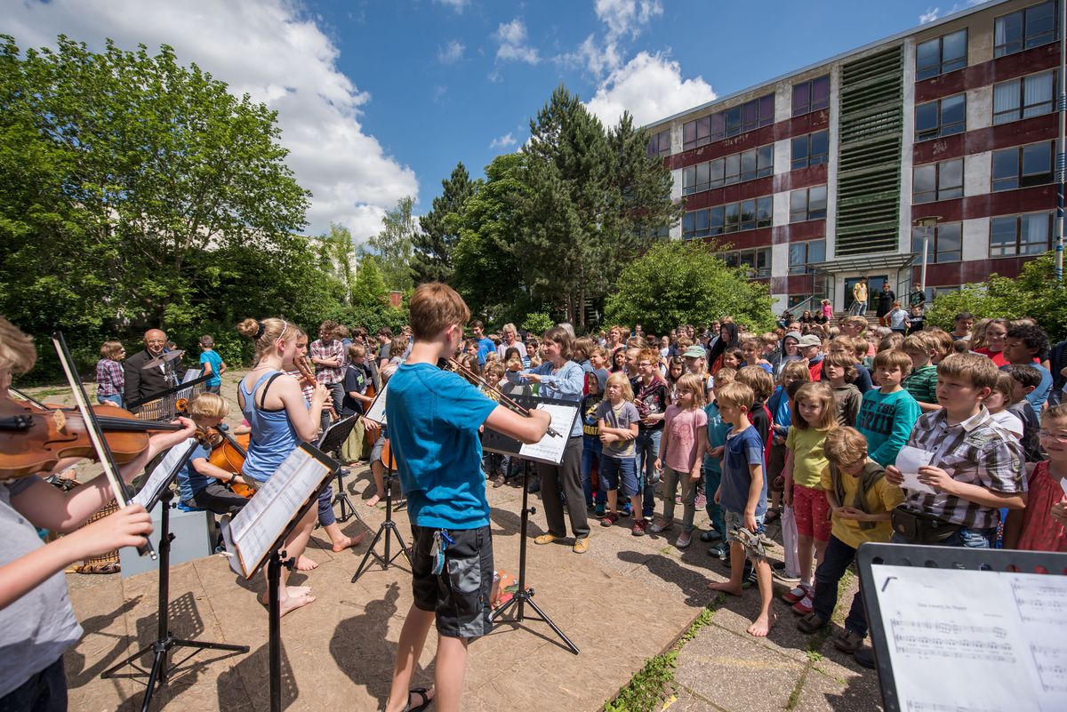 Beim Festakt kamen – musikalisch umrahmt durch die Elephant Band der Jenaplanschule Weimar – Schulleiterin Ilka Drewke, Barbara Pampe, Programmbereichsleiterin der Montag Stiftung, Bürgermeister Peter Kleine, IBA Geschäftsführerin Dr. Marta Doehler-Behzadi und Schulamtsleiter Ralph Leipold zu Wort.
