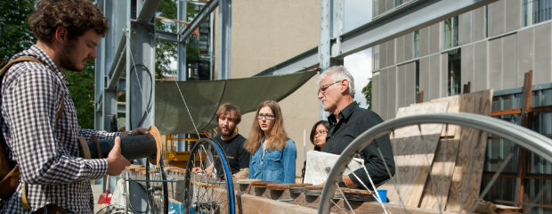 »Wo könnte ein Problem lauern, das wir derzeit nicht sehen?« - diese Frage richtet Prof. Bernd Rudolf gut eine Woche vor der summaery auf der Baustelle der Pavillons an die studentischen Projektgruppen. Traditionell beschäftigen sich Studierende im zweiten Semester des Bachelorstudiengangs Architektur damit, Mikroarchitekturen – also kleine temporäre Bauten oder Strukturen – zu planen und im Maßstab 1:1 umzusetzen. In diesem Jahr dreht sich alles um das Thema Energie. Aufgabe war es, bauliche Konzepte für die Energiegewinnung oder -speicherung zu entwickeln.