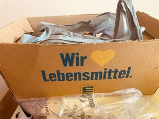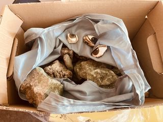 - Supermarkt-Karton mit diversen Steinen, z.T. eingewickelt in Papier (siehe Foto)