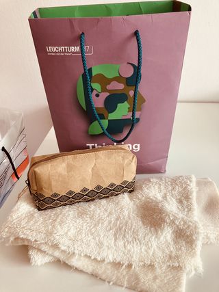 - Light brown pencil case + various stationery items