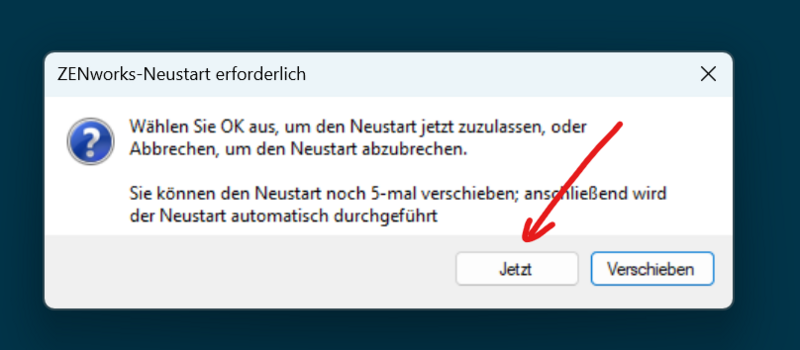 Wenn die Aufforderung zum Neustart erscheint, dann schließen Sie bitte alle Programme und klicken Sie auf "Jetzt". Wenn Sie auf "Verschieben" klicken, dann erscheint die Meldung wiederholt." (ABB2)