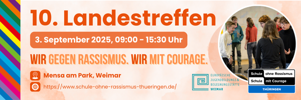 Am 03. September findet das 10. große Landestreffen des Netzwerks Schule ohne Rassismus – Schule mit Courage in Weimar statt. Dazu versammeln sich Schüler*innen und Pädagog*innen aus ganz Thüringen, die sich an ihren Schulen aktiv gegen Diskriminierung und für eine gelebte Demokratie engagieren. Der Tag ist gefüllt mit einem bunten Programm: es wird eine Vielfalt an Workshops für alle Altersgruppen angeboten, dazu Mitmach- und Kennenlernangebote von Akteur*innen der politischen Bildung in Thüringen sowie Räume zum gegenseitigen Austausch. Auch kostenfreie Verpflegung wird bereitgestellt.