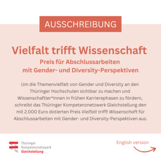 Um die Themenvielfalt von Gender und Diversity an den Thüringer Hochschulen sichtbar zu machen und Wissenschaftler*innen in frühen Karrierephasen zu fördern, schreibt das Thüringer Kompetenznetzwerk Gleichstellung den mit 2.000 Euro dotierten Preis Vielfalt trifft Wissenschaft für Abschlussarbeiten mit Gender- und Diversity-Perspektiven aus.